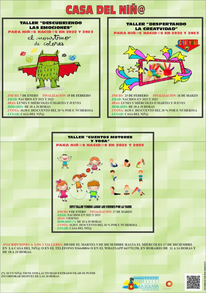 LAS INSCRIPCIONES A LOS 3 TALLERES SE PODRÁN REALIZAR DESDE EL 9 HASTA EL 17 DE DICIEMBRE EN LA CASA DEL NIÑ@ O EN EL TELÉFONO 926648804 O EN EL WHATSAPP 663751258 EN HORARIO DE 11 A 14 HORAS Y DE 18 A 20 HORAS.