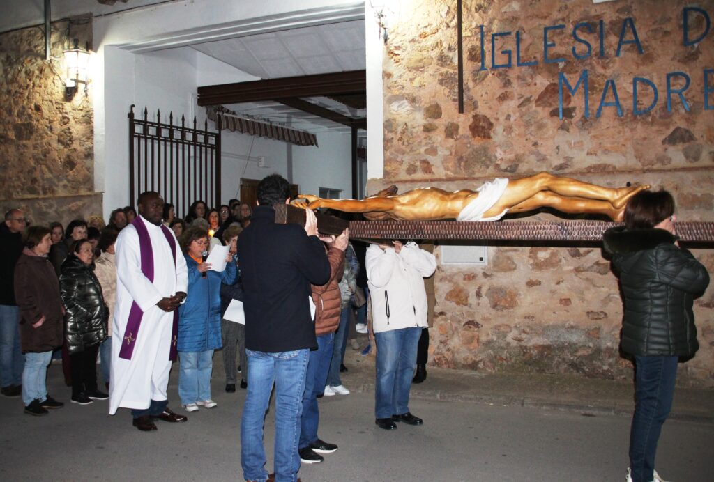 Abría el cortejo la cruz parroquial, seguida del Cristo que a lo largo de todo el año preside el altar mayor del templo. La imagen era portada por los fieles que participan en el viacrucis, que la llevan de forma horizontal sobre los hombros sin ningún tipo de andas o carroza. Los fieles seguían la imagen mientras el coro de Santa María entonaba cánticos, que eran acompañados por quienes realizaban el recorrido.