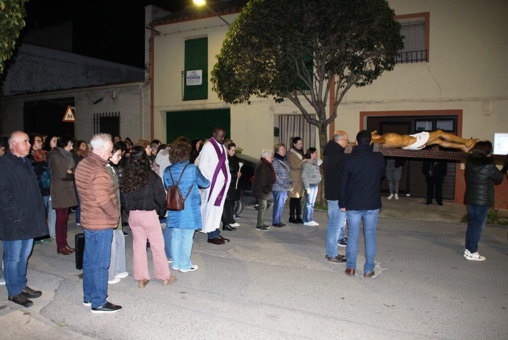 Las catorce estaciones del viacrucis fueron meditadas en otros tantos puntos del itinerario, momento en el que se mezclaban con la voz de las personas que leían lo que correspondía a cada una de ellas, a pesar del fuerte viento que movía el papel cuando se intentaban leer las líneas de cada meditación. Pese a lo desapacible de la noche, fueron muchos los fieles que asistieron al viacrucis, que finalizó con el besa pies al Cristo, antes de que volviera a ser colocado en el centro del altar mayor del templo, donde permanecerá hasta la próxima Semana Santa.