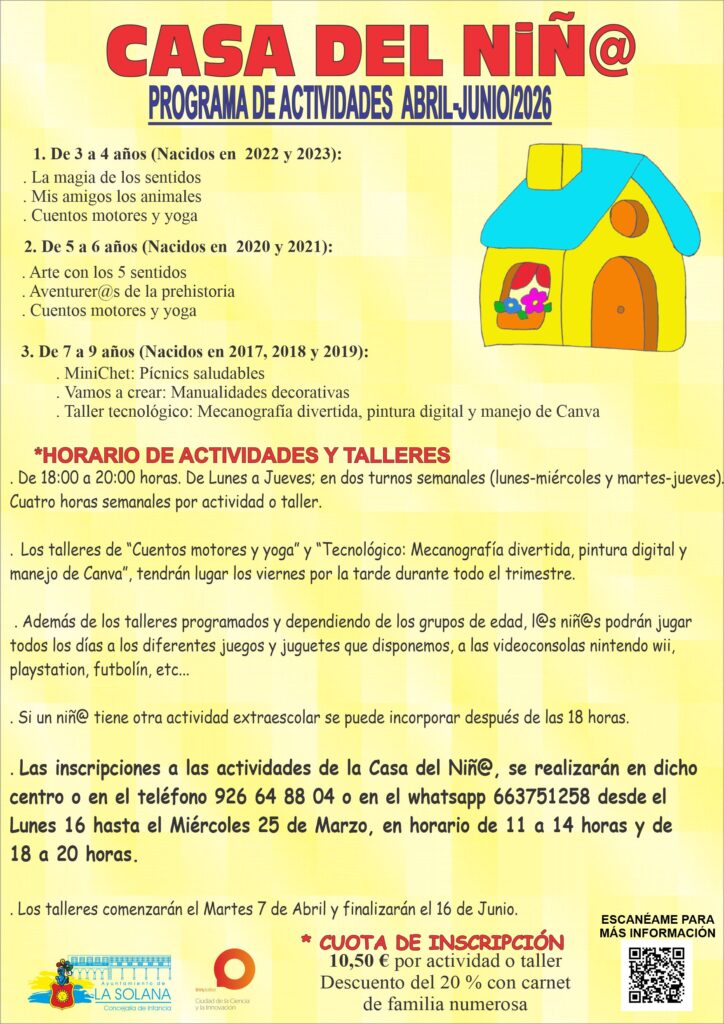 Las inscripciones a las actividades de la Casa del Niñ@ para el trimestre Abril-Junio del año 2026 se realizaran en la Casa del Niñ@, situada en la calle Zaragoza 96 ó en el teléfono 926 64 88 04 ó en el whatsapp 663751258 desde el lunes 16 de marzo hasta el miércoles 25 de marzo en horario de 11 a 14 horas y de 18 a 20 horas.