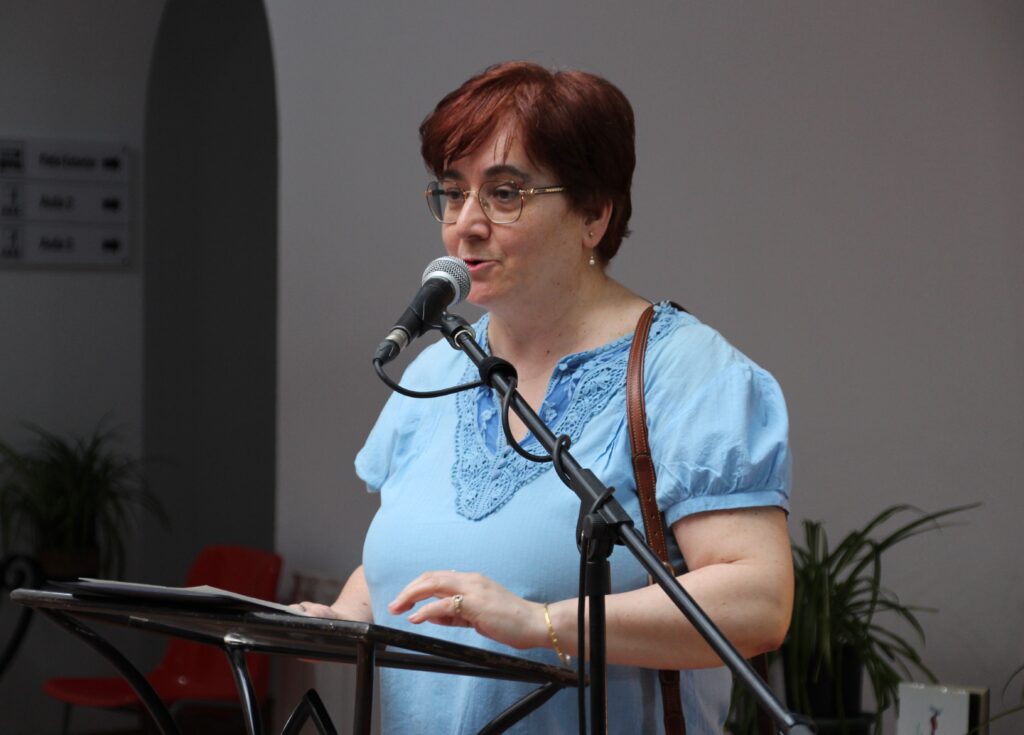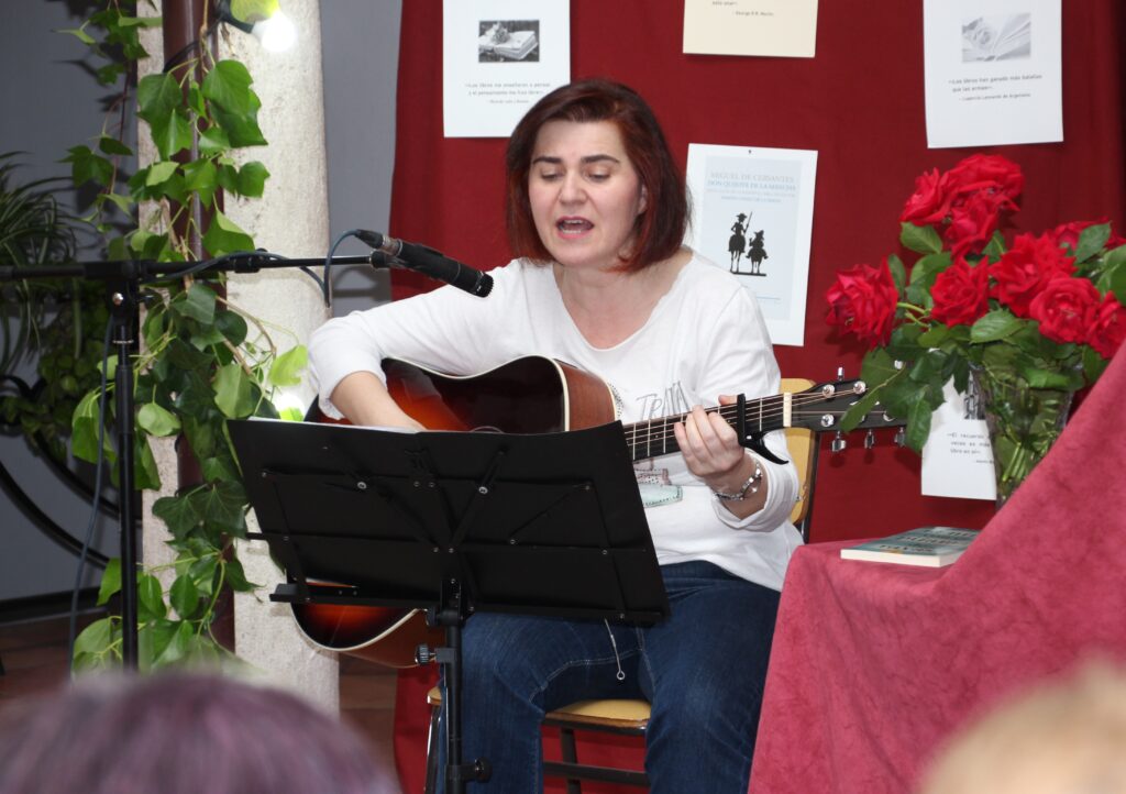 Entre lectura y lectura, la música encontró también su lugar. La voz de Cati Salcedo, acompañada por su guitarra, aportó una atmósfera cálida y envolvente con la interpretación de tres canciones. Reconoció que no pudo negarse a colaborar con la Universidad Popular porque es una alumna asidua del centro desde hace muchos años. Abrió con el tema Entonces de Rozalén y cantaría en mitad de la velada Correspondencia ilegal de Pasión Vega y concluyó con Un hombre sentado al piano de Ana Belén. Reconoció que no pudo negarse a colaborar con la Universidad Popular porque es una alumna asidua del centro desde hace muchos años.