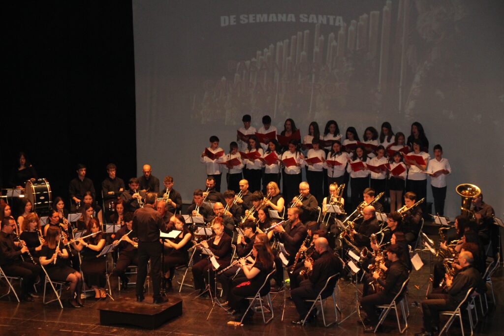 Así concluiría la primera parte de la gala. Posteriormente, llegaría el turno de la Banda Municipal de Música que, bajo la dirección de Ángel Sancho Moraga, interpretó un alusivo concierto de marchas procesionales que envolvió el teatro en una atmósfera solemne y emotiva. Esta vez, los músicos contaron con la colaboración del coro de la Escuela de Música y de las sopranos Petri Casado y Yolanda Salamanca, que pusieron las voces a conocidas partituras cofrades. El programa estuvo compuesto por los temas Hermanos Costaleros, Pasan los campanilleros, Callejuela de la O, A ti Manué, La Saeta y La esperanza de María. Todas ellas arrancaron largos aplausos del público, que también supo ovacionar a los músicos solistas de la velada, especialmente los trompetas.