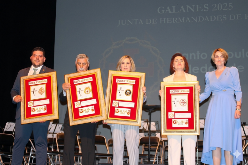 Emoción, solemnidad, tradición y cultura popular, marcaron la 37ª gala de los premios Galanes que acogió el Teatro Tomás Barrera la noche del viernes. La Junta de Hermandades de Pasión, recibió un merecido homenaje cargado de simbolismo y gratitud hacia quienes han sostenido y continúan trabajando para engrandecer la Semana Santa solanera. El galardón coincidía con el 50 aniversario de la fundación de un colectivo que engloba a las cuatro cofradías que organizan las procesiones en esos intensos días: la Cofradía de la Santa Vera Cruz y Virgen de la Esperanza, la Cofradía de la Esclavitud de Jesús Rescatado, la Cofradía de la Virgen de las Angustias y la Cofradía del Santo Sepulcro y Soledad de la Virgen.
