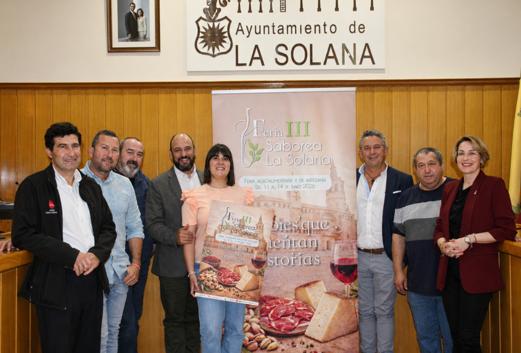La III Edición de la Feria Agroalimentaria ‘Saborea La Solana’ ya tiene imagen oficial. El Salón de Plenos del Ayuntamiento acogió la presentación del cartel de este evento que se celebrará del 11 al 14 de junio en el recinto ferial y que continúa afianzándose como uno de los grandes escaparates de la riqueza gastronómica y artesanal del municipio. El acto contó con la participación del concejal de Promoción Económica y Turismo, Santiago López, la concejala de Bienestar Social, Toñi Ramos, la alcaldesa, Luisa Márquez, y representantes de empresas agroalimentarias locales.