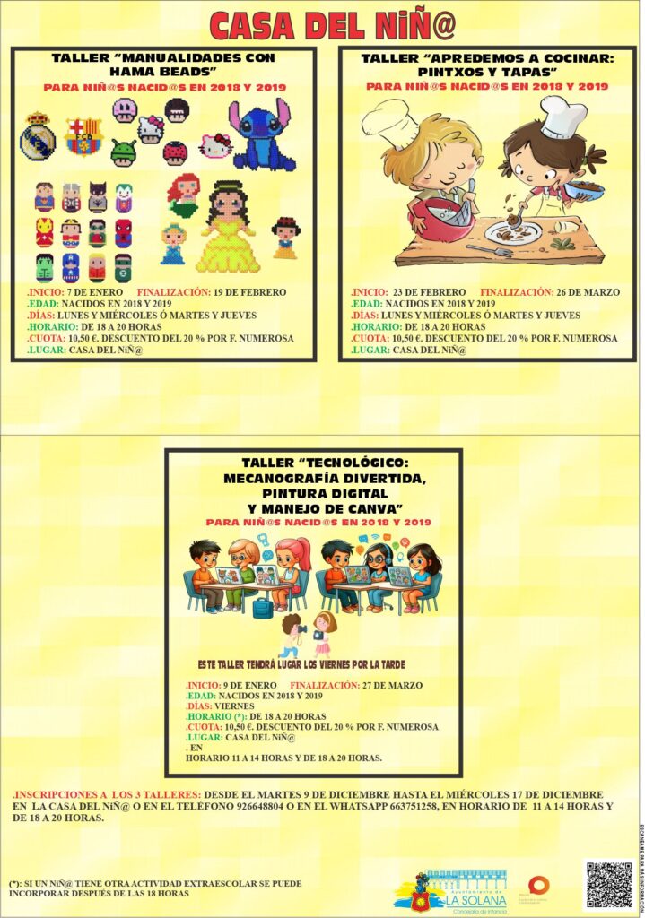 LAS INSCRIPCIONES A LOS 3 TALLERES SE PODRÁN REALIZAR DESDE EL 9 HASTA EL 17 DE DICIEMBRE EN LA CASA DEL NIÑ@ O EN EL TELÉFONO 926648804 O EN EL WHATSAPP 663751258 EN HORARIO DE 11 A 14 HORAS Y DE 18 A 20 HORAS.